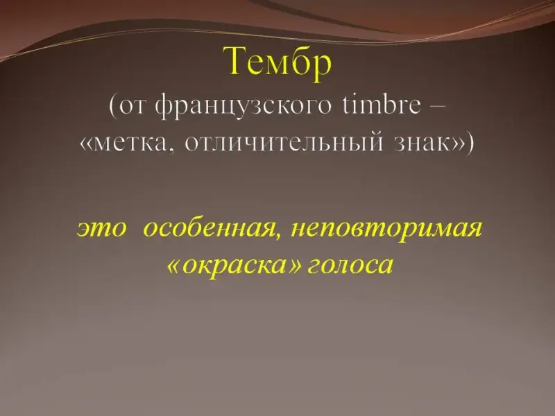 - У каждого из нас свой, не похожий на других, оттенок голоса. Эту особенную, неповторимую «окраску» голоса музыканты называют французским словом «тембр». Повторите это слово. (Тембр.)
