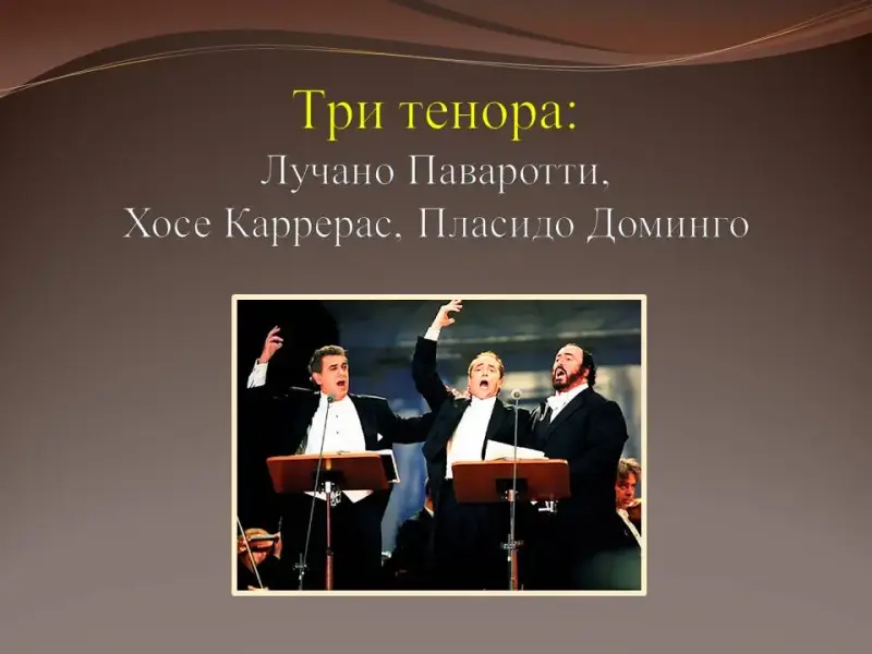 - 7 июля 1991 года в Риме при открытии чемпионата мира по футболу впервые выступили три выдающихся тенора: Лучано Паваротти, Хосе Каррерас и Пласидо Доминго. Запись выступления певцов разошлась рекордным тиражом в истории классической музыки. (Звучит запись голосов.)