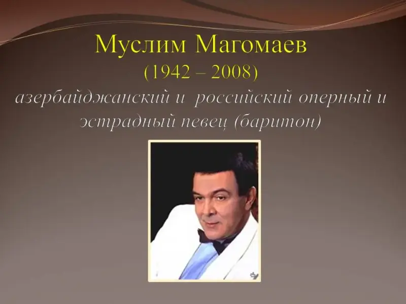 - Муслим Магомаев - азербайджанский и российский оперный и эстрадный певец и композитор. Он обладал необыкновенным, красивым голосом. В его репертуаре было более 600 произведений. По сей день, он остаётся кумиром для многих поколений людей. (Звучит запись голоса певца.)