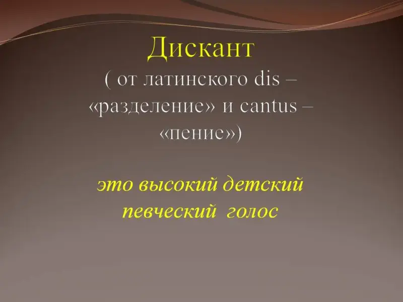 - Дискант - это высокий детский певческий голос. Повторите это слово. (Дискант.)