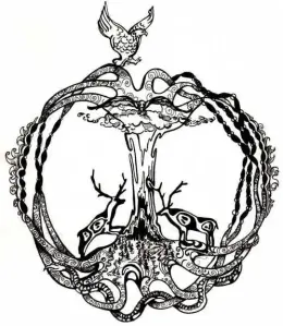 Учитель: На трех уровнях древа размещался весь животный мир, олицетворенный орлом на верхнем уровне; оленями, поедающими листья, на среднем уровне; змеем, грызущим корни, - на нижнем. В его кроне сидят птицы - души умерших, а корни могут превращаться в реки подземного царства, на листьях записаны судьбы людей, и каждый опавший лист - это умерший человек. Так представлен мир у древних скандинавов (древо Иггдрасиль) слайды 10-11.