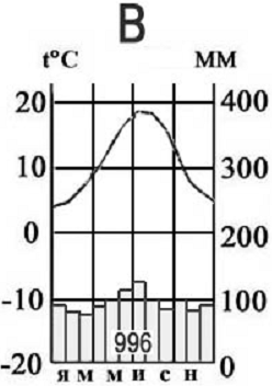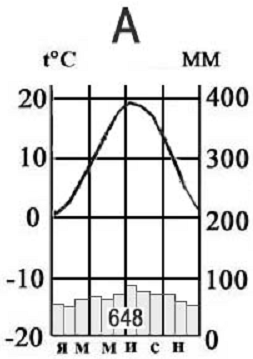 б) На климатограмме летние температуры умеренного пояса +16. Но и в субарктический пояс летом приходят умеренные воздушные массы. Но на графике зимой морозно -22. А мы знаем, что в субарктический