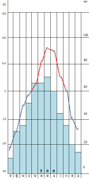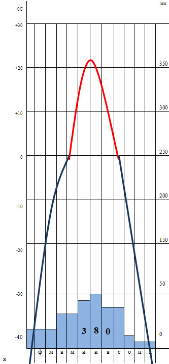 - Это резко-континентальный климат, потому что амплитуда температур очень большая 65 градусов, а годовое количество осадков менее 400 мм с летним максимумом (июль).