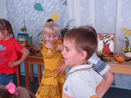 Под весёлую песню "Разноцветная осень" Т. Морозовой гости заходят в музыкальный зал, где их встречают дети - хозяева.