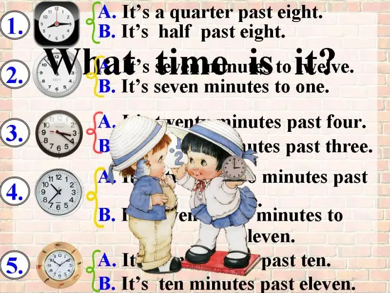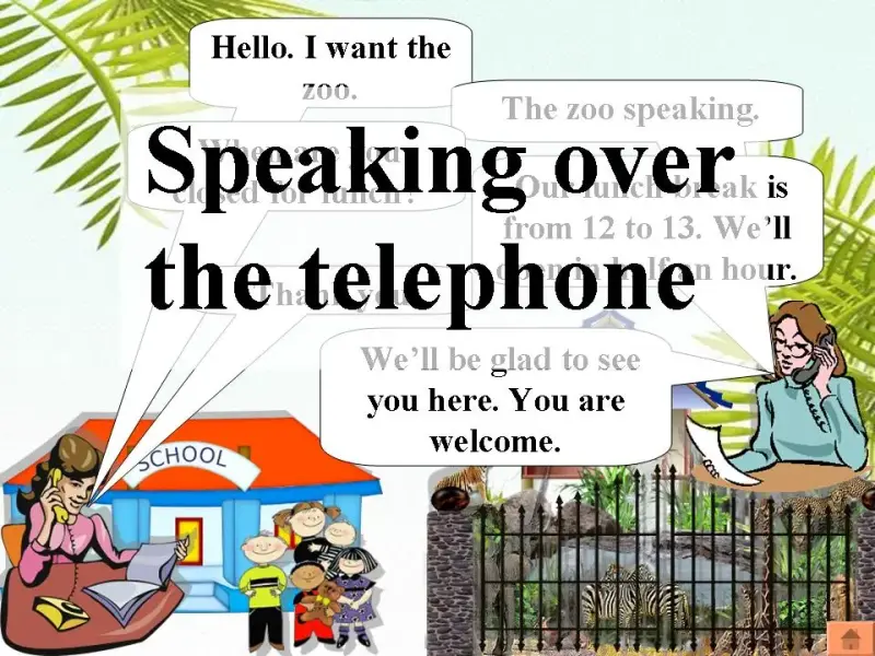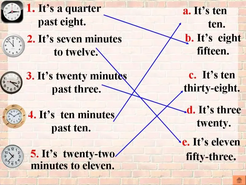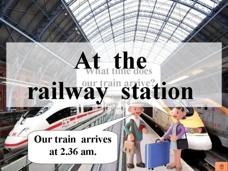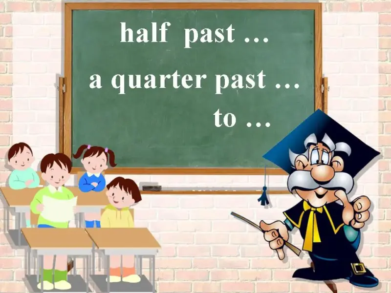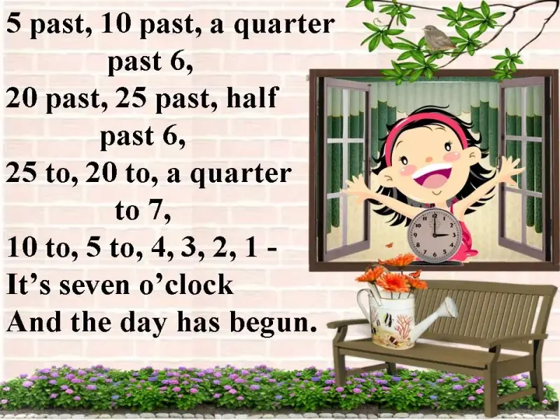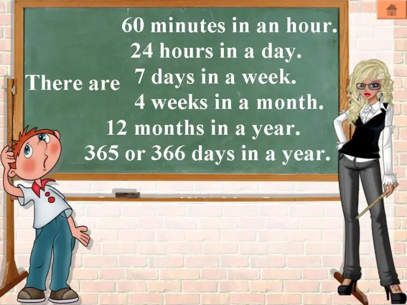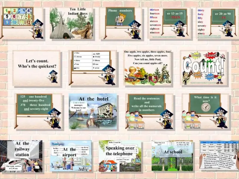 Слайды 40-46 позволяют познакомиться с тем, как по-английски говорится время. Cлайды 41-42 объясняют правило. Слайд 43 предусматривает работу с рифмовкой по теме. На слайде 44 учащиеся должны правильно назвать время, которое показывают часы. Слайд 45 предусматривает выбор правильного предложения, слайд 46 - соединение двух предложений, а ряд простых повседневных ситуаций («На вокзале» слайд 47, «В аэропорту» слайд 48, «Разговор по телефону» слайд 49, «В школе» слайд 50) демонстрируют учащимся использование числительных в повседневных ситуациях и помогают связать процесс обучения с реальной жизнью.