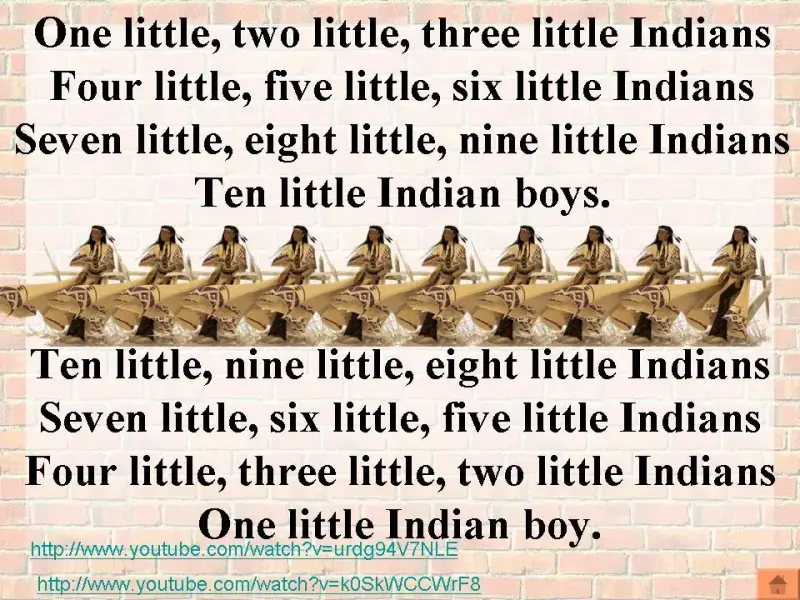 Слайды 8-9 посвящены рифмовке «Ten Little Indians». На слайде 8 даны ссылки на песню «Ten Little Indians» в разном исполнении.
