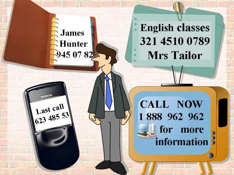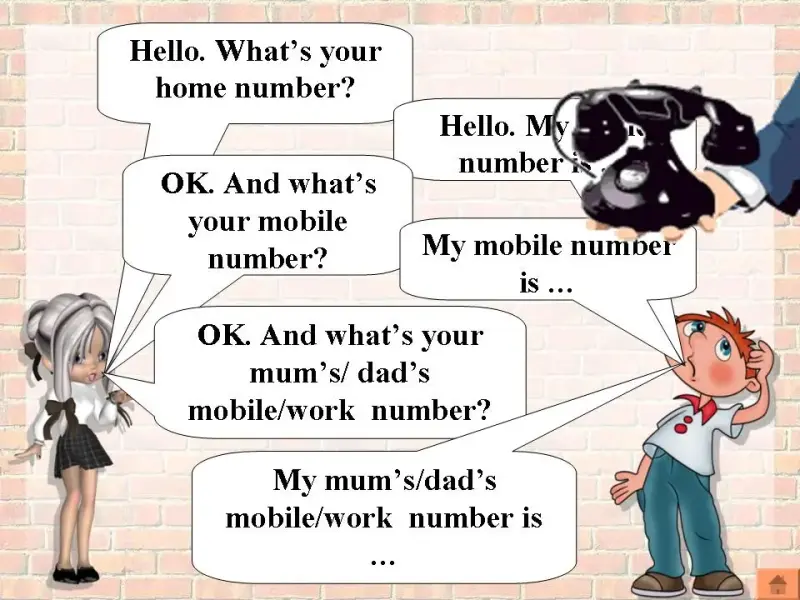 Слайды 10-14 посвящены правилам чтения номеров телефонов. От простого чтения номеров телефонов (слайды 11-12) учащиеся переходят к составлению предложений (слайд 13), а затем и к составлению диалогов (слайд 14).