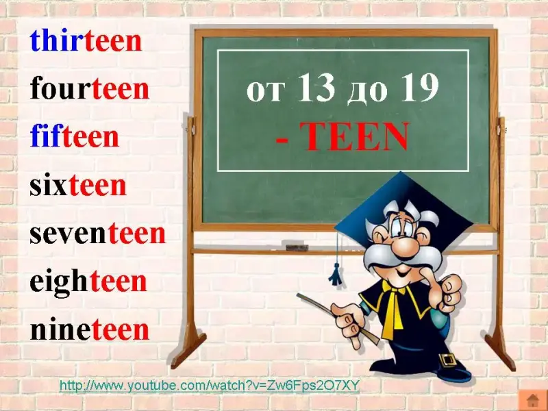 Слайд 15 знакомит учащихся с правилом образования английских числительных от 13 до 19, а слайд 16 - от 20 до 90. На слайде 15 дается ссылка на песню с числительными от 1 до 20.