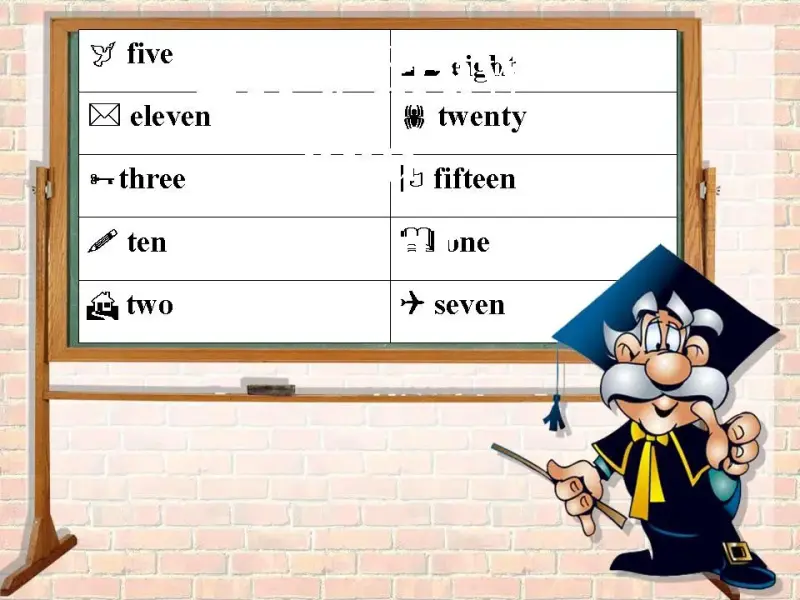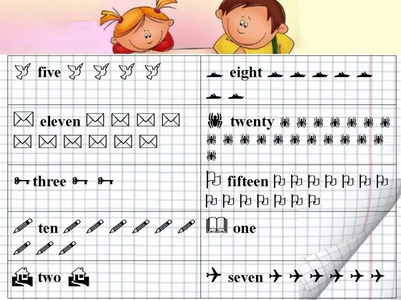 Слайды 19-21 направлены на повторение и закрепление английских числительных, а с другой стороны, способствуют развитию творческих способностей учащихся. Задание может выполняться как индивидуально, так и в парах и в группах. Учащиеся получают отпечатанные таблицы. В каждой ячейке таблицы написано английское числительное и дана картинка. Задача учащихся - нарисовать данную картинку нужное количество раз, а затем составить предложения с получившимися словосочетаниями (слайд 21).