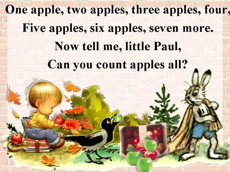 Если эта рифмовка используется при изучении темы «Продукты», то можно предложить учащимся заменить слово apples на любое другое по теме: oranges, peaches, potatoes, carrots и т.д.