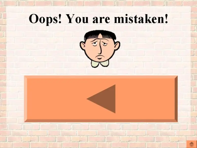 Слайды 22-25 посвящены работе с рифмовкой-загадкой. Задача учащихся - прочитать ее, перевести и сосчитать количество яблок, которые есть у мальчика. На слайде 23 даны три варианта ответов, нажав на которые ученики попадают на слайд 24 «Well done! How clever of you!», если задача решена правильно, и на слайд 25 «Oops! You are mistaken!», если допущена ошибка.