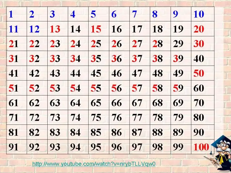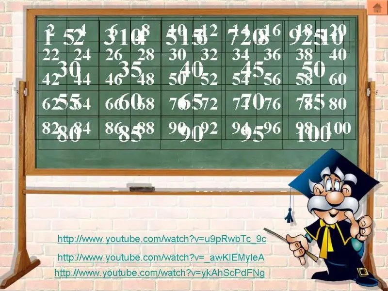 Слайды 26-32 позволяют познакомиться/отработать/закрепить/повторить английские числительные от 1 до 100. При работе с этими числительными опять можно использовать песню (ссылка дана на слайде 27). Слайд 28 дает возможность считать единицами от 1 до 10, повторить все четные числительные, считать через пять и т.д. На слайде 28 опять даны ссылки на песни.