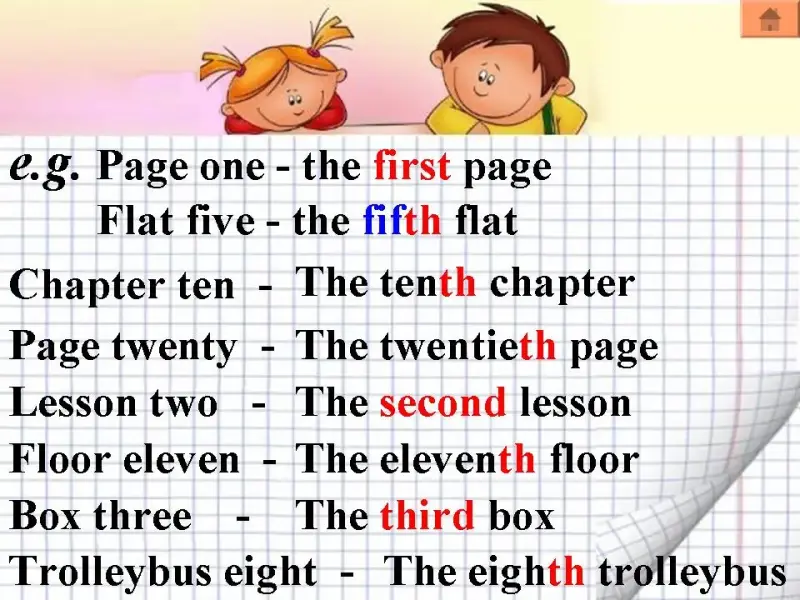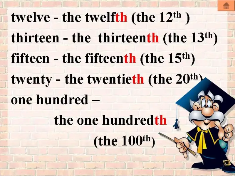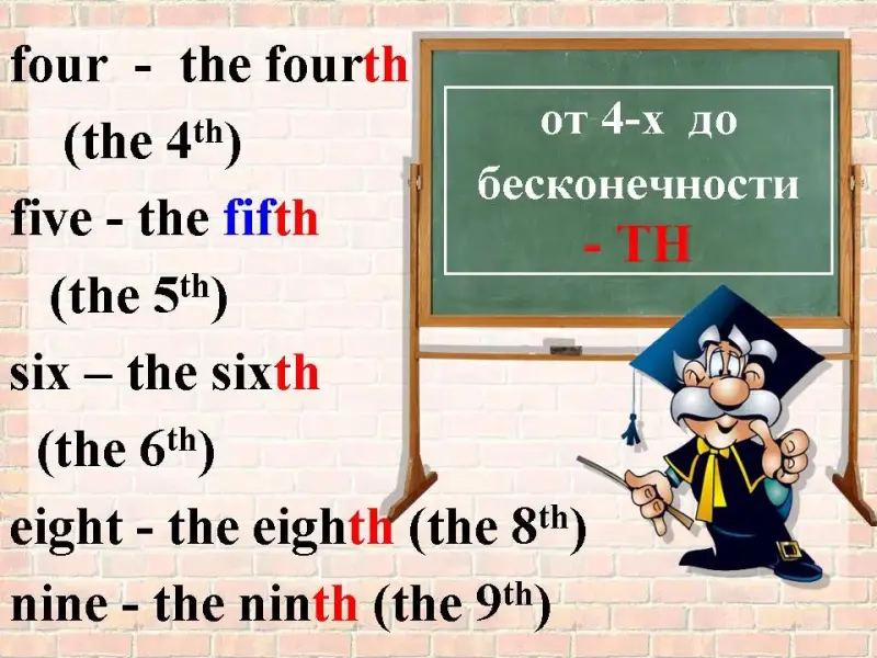 Слайды 4-5 знакомят учащихся с правилом образования порядковых числительных от 4 до бесконечности, а слайд 6 - с исключениями: с порядковыми числительными «первый, второй, третий».
