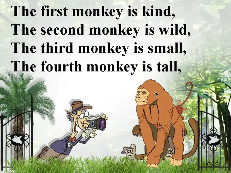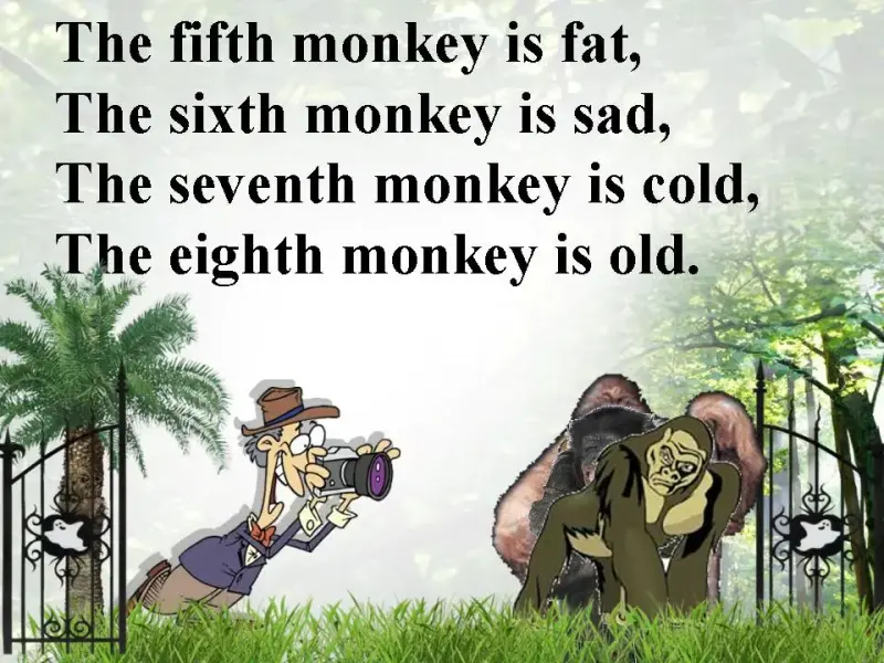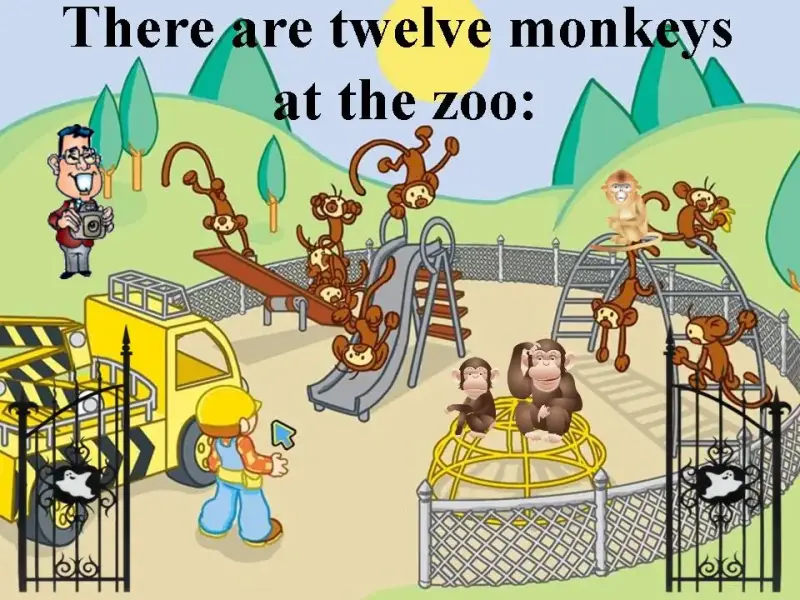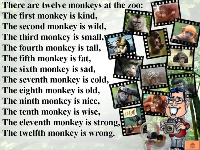 Слайды 8-13 посвящены рифмовке с порядковыми числительными «Twelve monkeys at the zoo». Эта рифмовка позволяет отработать и запомнить как порядковые числительные, так и прилагательные small, tall, kind, wild и т.д.