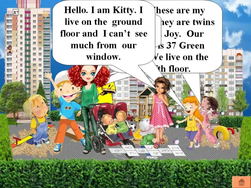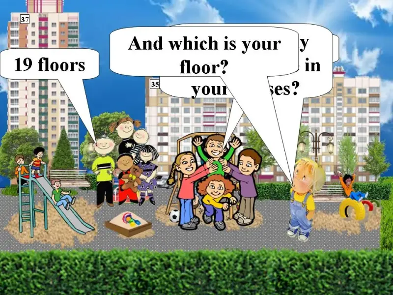 Слайды 16-20 на примере простых диалогов знакомят учащихся с тем, как правильно сказать по-английски адрес, сколько этажей в доме, на каком этаже живешь и т.д.