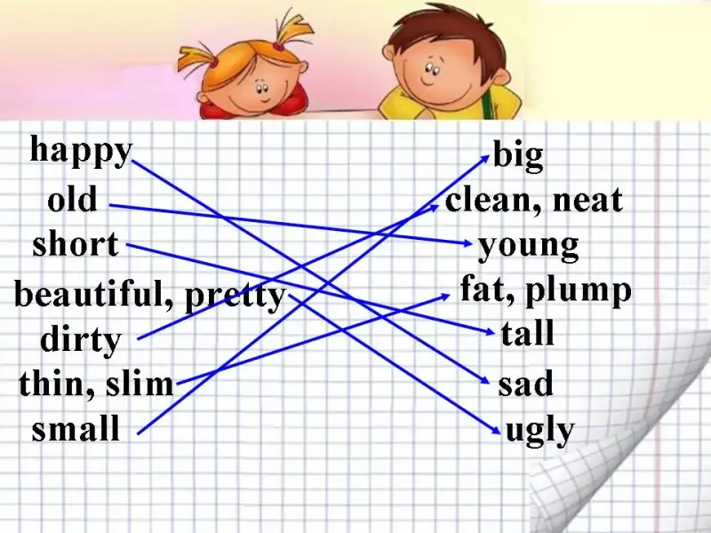 На слайде 22 эти же прилагательные разделены на два столбика. Задача учащихся - соединить антонимы, после чего учащимся предлагается, используя эти прилагательные, описать людей. На слайде 23 даются готовые предложения, на слайде 24 учащиеся выполняют аналогичное задание самостоятельно.