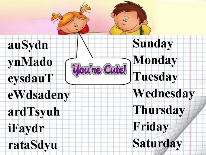 Слайды 30-32 посвящены дням недели. Сначала учащиеся составляют дни недели, восстанавливая порядок букв в словах, а затем составляют предложения по образцу, используя порядковые числительные, например : Sunday is the first day of the week. Monday is the second day of the week и т.д.
