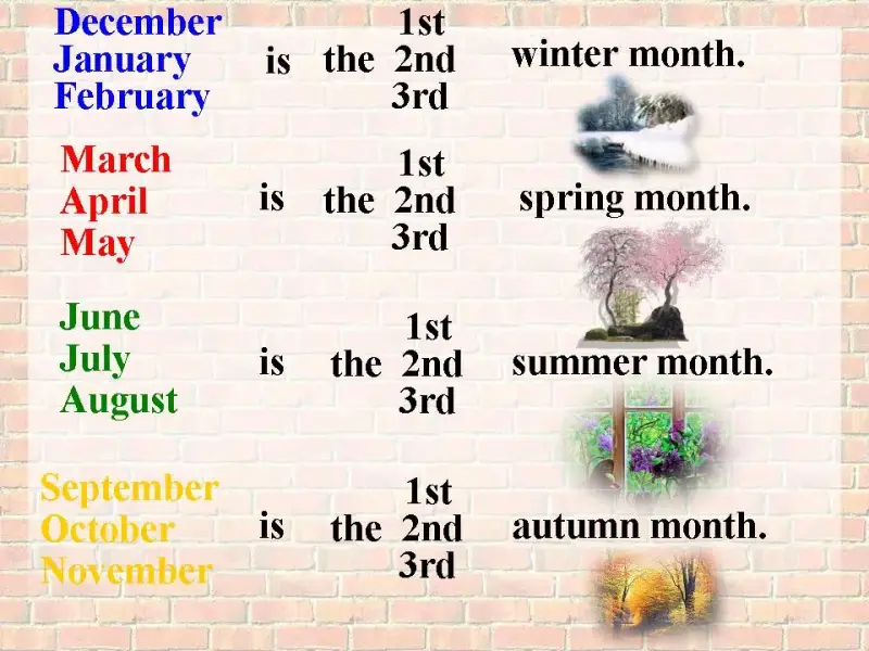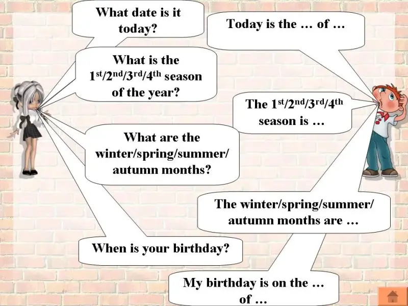 При помощи слайда 38 учащиеся составляют диалог о временах года и месяцах, используя как количественные, так и порядковые числительные.