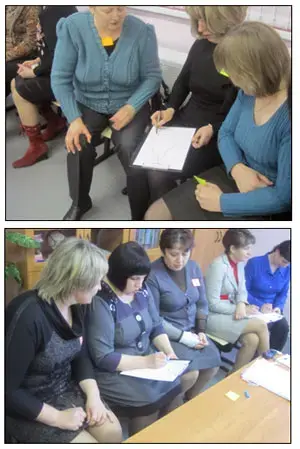 Примечание: По окончанию игры были сформированы четыре большие группы участников (в каждой по 10 человек) для дальнейшей работы на педсовете.