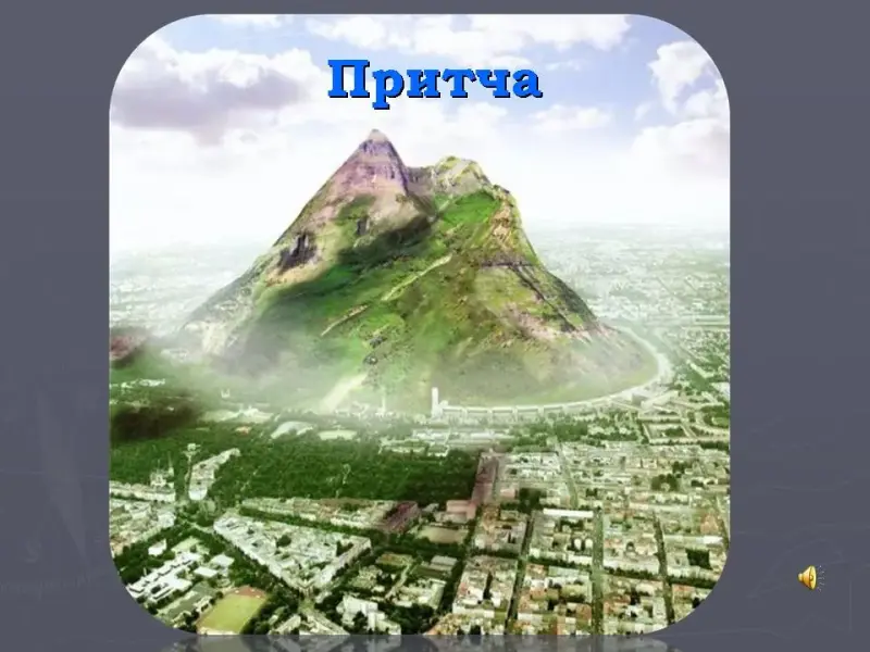 Слайд 2. В одной далекой стране была прекрасная долина. На краю долины стояла Гора. Это была самая красивая Гора на всем белом свете. У ее подножия раскинулся городок, чьи жители всегда любовались Горой и ее вершиной. Они знали также, что те люди, которым удалось побывать на вершине, обрели благополучие: душевное и материальное, жили долго и счастливо.