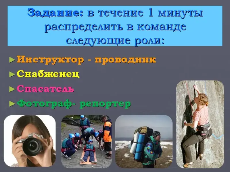 Задание: Вам необходимо в течение 1 минуты распределить в команде следующие роли: