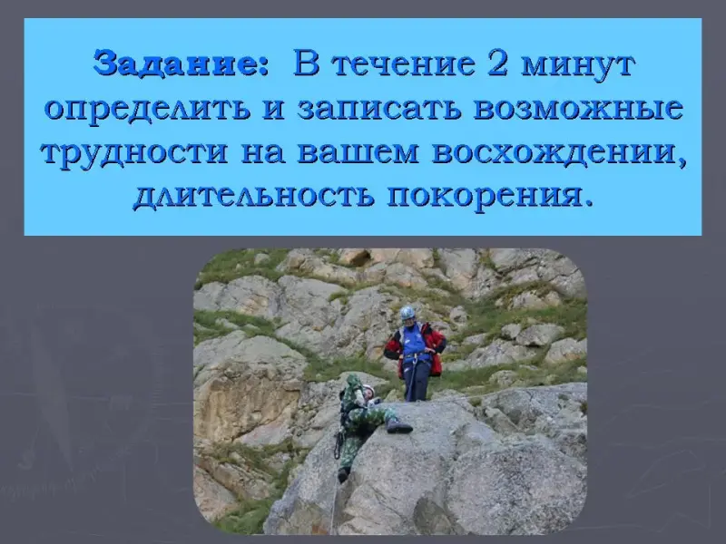 Задание: В течение 2 минут определить и записать возможные трудности на вашем восхождении, длительность покорения.