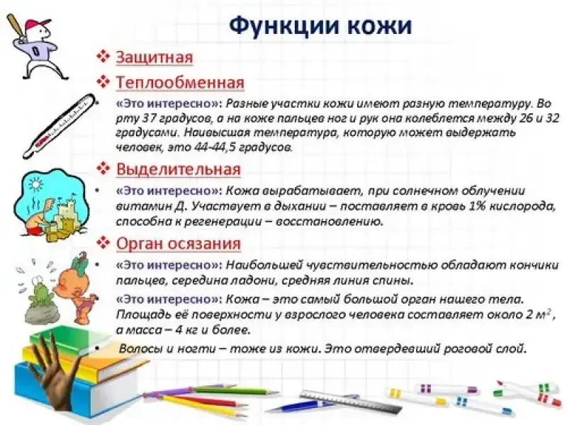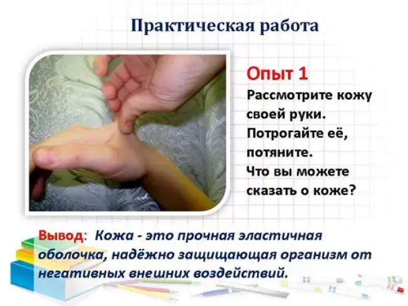 - Кожа помогает нам ощущать предметы, тепло, холод. Мы воспринимаем давление, прикосновение. С помощью кожи мы судим о размерах, форме, мягкости, твёрдости.