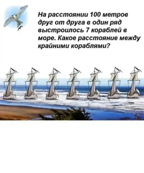 - На расстоянии 100 метров друг от друга в один ряд выстроилось 7 кораблей в море. Какое расстояние между крайними кораблями? (600 метров)
