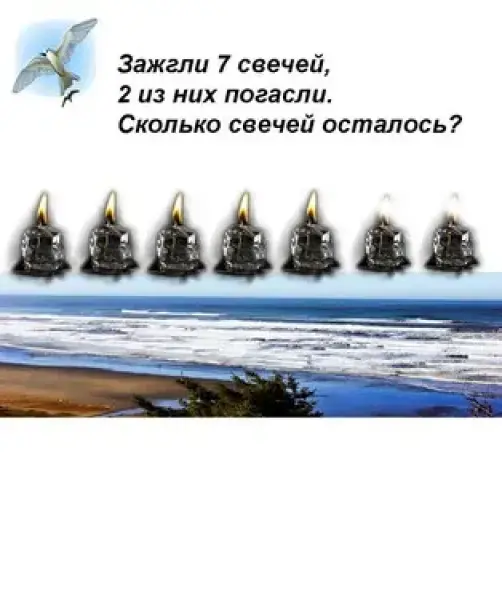 - Зажгли 7 свечей, 2 из них погасли. Сколько свечей осталось? (7 свечей)