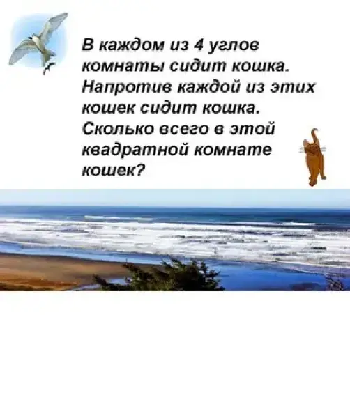 - В каждом из 4 углов комнаты сидит кошка. Напротив каждой из этих кошек сидит кошка. Сколько всего в этой квадратной комнате кошек? (4 кошки)