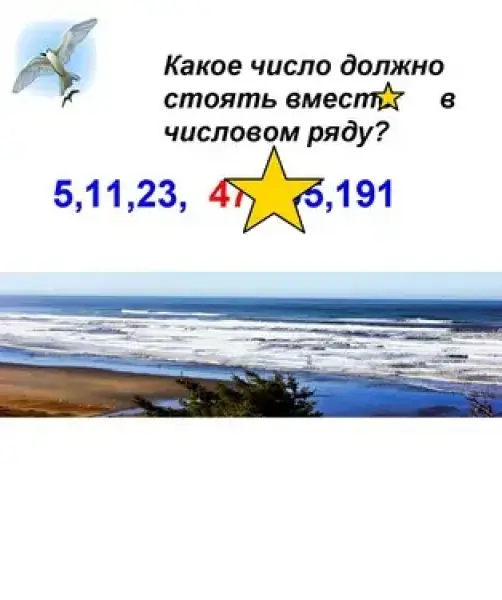 - Какое число должно стоять вместо * в числовом ряду? 5,11,23,*,95,191. (47)