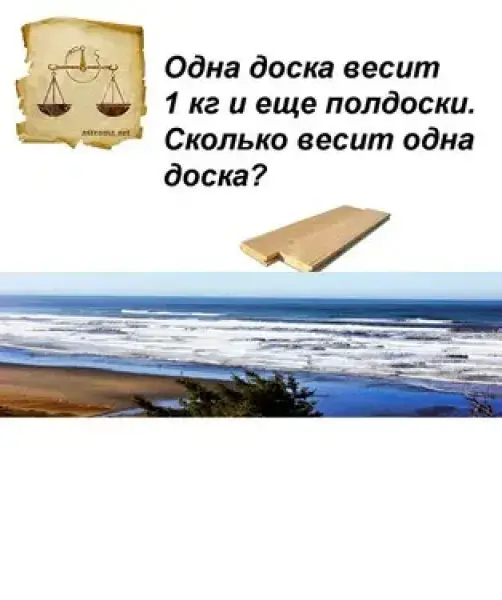 - Одна доска весит 1 кг и еще полдоски. Сколько весит одна доска? (2 кг)