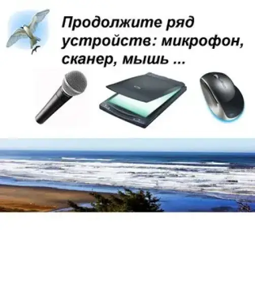- Продолжите ряд устройств: микрофон, сканер, мышь ... (клавиатура, джойстик и другие устройства ввода информации)