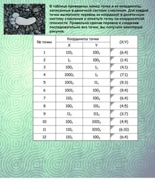 В таблице приведены номер точки и ее координаты, записанные в двоичной системе счисления. Для каждой точки выполните перевод ее координат в десятичную систему счисления и отметьте точку на координатной плоскости. Правильно сделав перевод и соединив последовательно все точки, вы получите некоторый рисунок. Рисунок изобразите на доске.