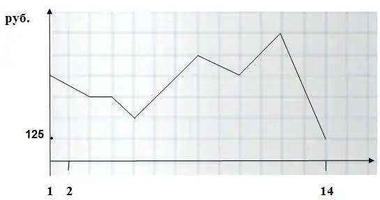 На графике, изображенном на рисунке <Рисунок 4>, представлено изменение биржевой стоимости акций горнодобывающей компании в первые две недели февраля. В первую неделю февраля бизнесмен купил 12 акций, а потом продал их на второй неделе. Какую наибольшую прибыль (в рублях) он мог получить?
