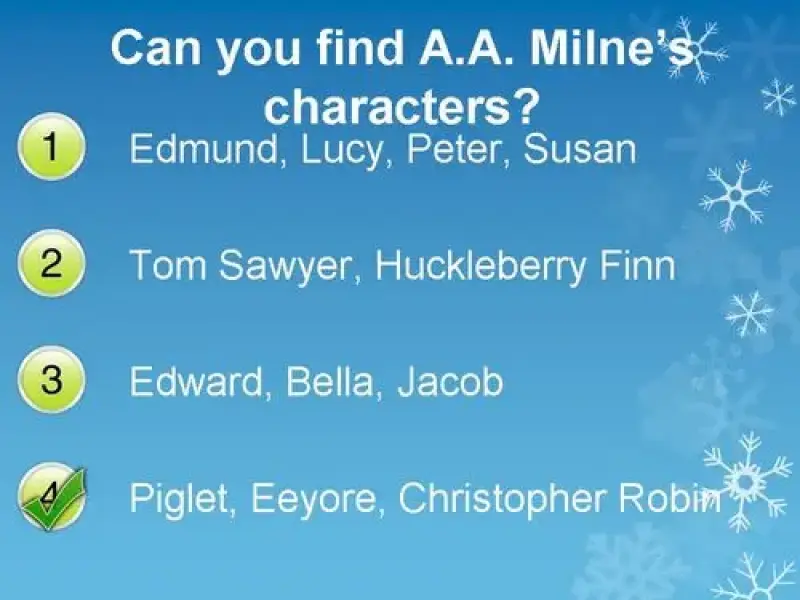 | 5 | 4-й вопрос: "Can you find A.A. Milne's characters?" | "Piglet, Eeyore, Christopher Robin" |