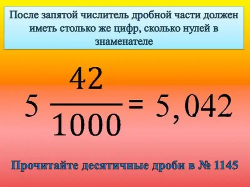 После запятой числитель дробной части должен иметь столько же цифр, сколько нулей в знаменателе. Работа по учебнику №1145