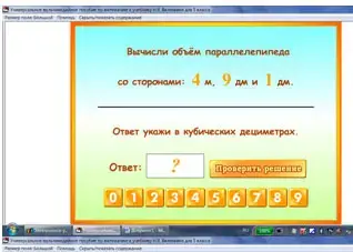 CD-Универсальное мультимедийное пособие по математике для 5 класса имеет большой набор тренировочных упражнений по теме «Единицы объёма», которые сопровождаются проверкой результата.