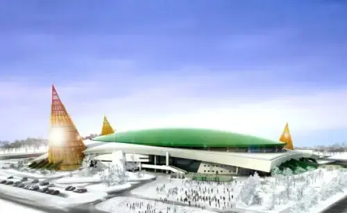 Конькобежный стадион находится в левобережной части г. Астана. Здание конькобежного стадиона общей площадью более 40 000 квадратных метров трапециевидное в плане, состоит из крытой арены с трибунами на 8773 посадочных мест и вспомогательными помещениями, пристроенных зданий: гостиницы, администрации, объединенных кровлей в единый комплекс.
