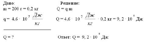 Самопроверка. Внимательно рассмотрите решение задач. Задача 1. Определите количество теплоты, выделившееся при сгорании 200 г бензина.