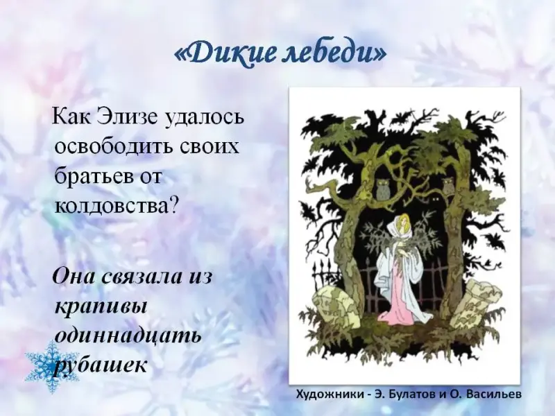 6. Как Элизе в сказке «Дикие лебеди» удалось освободить своих братьев от колдовства? (Она связала одиннадцать рубашек из крапивы)
