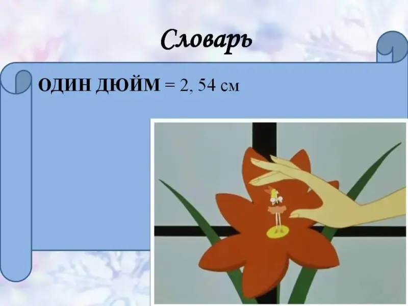 2. Как известно, Дюймовочка появилась на свет из цветка, выросшего из ячменного зернышка. «Она был такая нежная, маленькая, всего с дюйм ростом, вот ее и прозвали Дюймовочкой». Насколько же мала была Дюймовочка? Каков ее рост в пересчете на сантиметры? (Один дюйм = 2, 54 см)