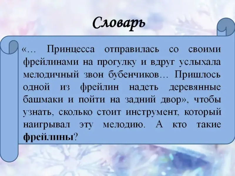 5. «… Принцесса отправилась со своими фрейлинами на прогулку и вдруг услыхала мелодичный звон бубенчиков». Ее крайне заинтересовал инструмент, который наигрывал эту мелодию. «Пришлось одной из фрейлин надеть деревянные башмаки и пойти на задний двор», чтобы узнать, сколько стоит этот инструмент. Кто же такие фрейлины? (Фрейлина - в Российской империи придворное звание. Давалось представительницам знатных дворянских фамилий. Фрейлины составляли свиту императриц и великих княгинь)