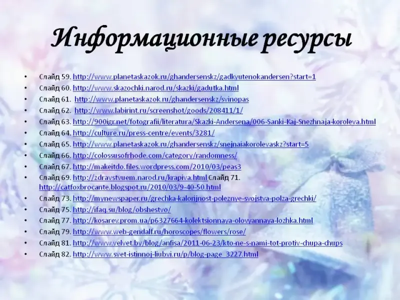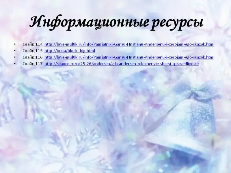 Просмотр заключительной части презентации «Памятники героям сказок Х.К.Андерсена» (слайды 105-118)