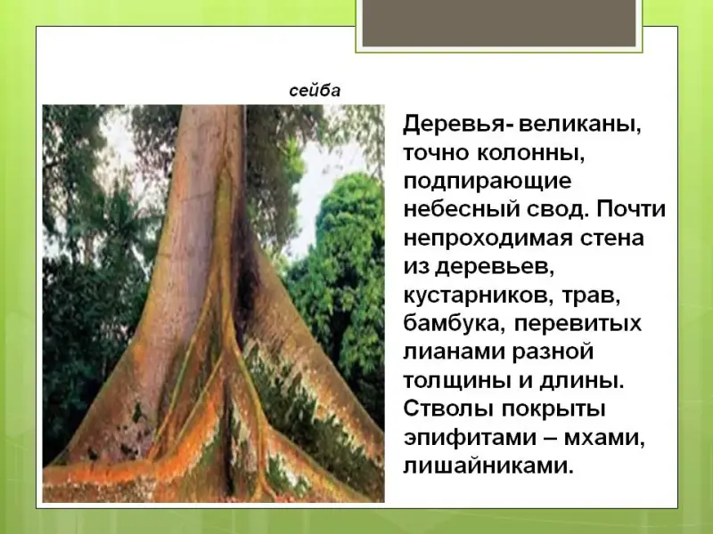 13 слайд. Верхний ярус образуют самые светолюбивые и высокие фикусы, пальмы, деревья с ходульными корнями, напоминающими лапы пауков и служащие для поддержки этих великанов. 14-15 слайды. Дерево фагара - сплошь покрытое шипами, а также дерево сейба с дисковидными корнями. Стволы деревьев покрыты эпифитами - мхами и лишайниками. Эпифиты растения не связанные с почвой и получающие из воздуха, атмосферных осадков, отмерших листьев. Эпифиты не паразитируют на хозяине, он лишь служит для них опорой. 16 -17 слайды. В среднем ярусе растут различные пальмы: 1. Масличная пальма - в период дождей даёт до 15 литров сладкого сока;