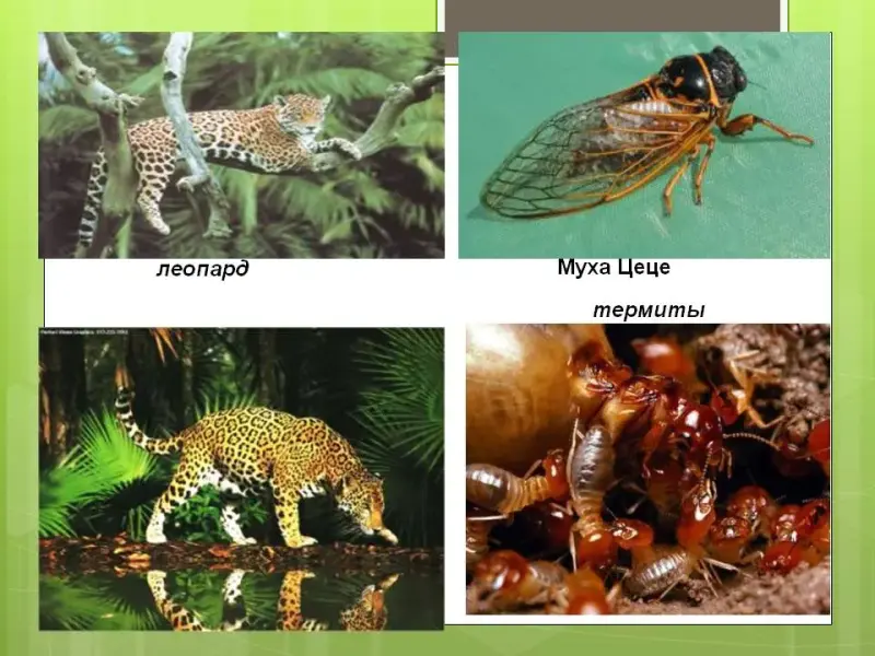 22 слайд. На лесных опушках и у берегов водоемов встречаются редчайшие на земле животные - карликовые бегемоты (ростом до 80 см) 23 слайд. Крупный хищник экваториальных лесов - леопард. В глухих, малодоступных местах сохранились самые крупные человекообразные обезьяны гориллы, которые больше нигде не встречаются. В рыхлой почве и лесной подстилке водятся змеи, ящерицы. Распространены муравьи. Некоторые из них истребляют на своем пути все живое. Змеи, ящерицы, термиты. Во все ярусах распространены муравьи, в т.ч. кочующие муравьи, передвигающиеся длинными колоннами и истребляющие все живое на своем пути. Настоящим бичом Африки является маленькая муха цеце, являющеюся переносчиком опасного заболевания вызывающую падеж скота и сонную болезнь у человека. Влажные экваториальные леса занимают небольшую часть поверхности Земли, но они играют особую роль. Эти «зеленые легкие» Земли вырабатывают около трети кислорода, содержащегося в атмосфере. Их уничтожение вызовет необратимые экологические последствия. Кроме того, лес играет важную роль хранителя почв, сдерживающих наступление пустынь. Уничтожь растительный покров - нарушится сезонный цикл дождей, обмелеют реки, землю разъест эрозия. Между тем, уже сегодня сведение экваториальных лесов приняло угрожающие масштабы. Каждый год в мире уничтожается 11 миллионов гектаров джунглей - площадь, равная четырем Бельгиям. Так, например, в Республике Конго леса сохранились лишь на 60% площади. Государство контролирует заготовку и экспорт древесины, лес восстанавливается, высаживают эвкалипты. В государстве Центральной Африки (Заир, Конго, Габон, Камерун) создаются новые национальные парки с целью сохранения экваториальных лесов. |