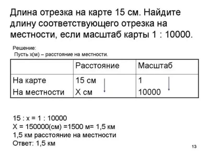 Задача. (слайд13) Длина отрезка на карте 15 см. Найдите длину соответствующего отрезка на местности, если масштаб карты 1 : 10000.