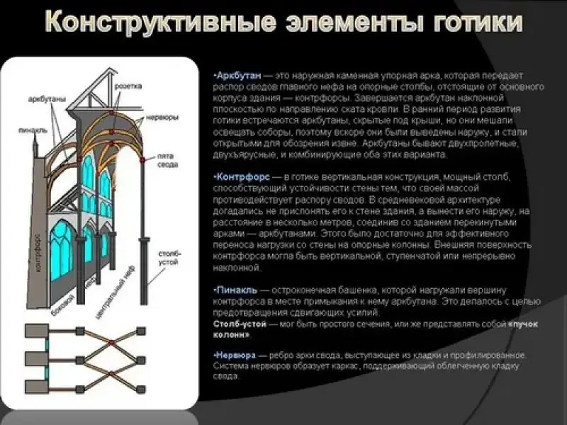 C появлением крестового свода, системы колонн, аркбутанов и контрфорсов, соборы приобрели вид громадных ажурных фантастических сооружений. Погашение нагрузок системой контрфорсов позволило сделать более тонкими и стены.