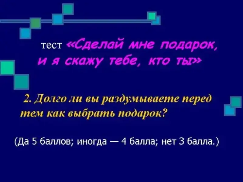 Подарок легче выбрать, если знаешь вкус того, кому он предназначен. Однако подарок выявляет и наш собственный вкус. И не только вкус, но и особенности характера. Ответьте на вопросы этого теста, подсчитайте очки и сравните выводы с вашим представлением о себе. (слайд 5 - 15, музыка Дидюля "Полёт на Меркурий")