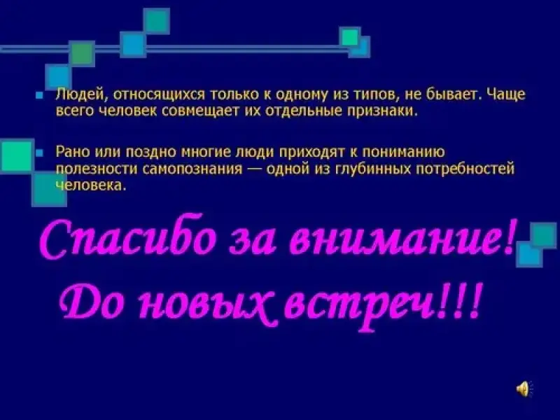 Людей, относящихся только к одному из типов, не бывает. Чаще всего человек совмещает их отдельные признаки. (слайд 24, музыка Din Martin)